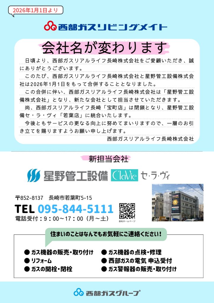 この度、弊社 西部ガスリアルライフ長崎株式会社は、令和8年1月1日をもちまして、星野管工設備株式会社と合併することとなりました。